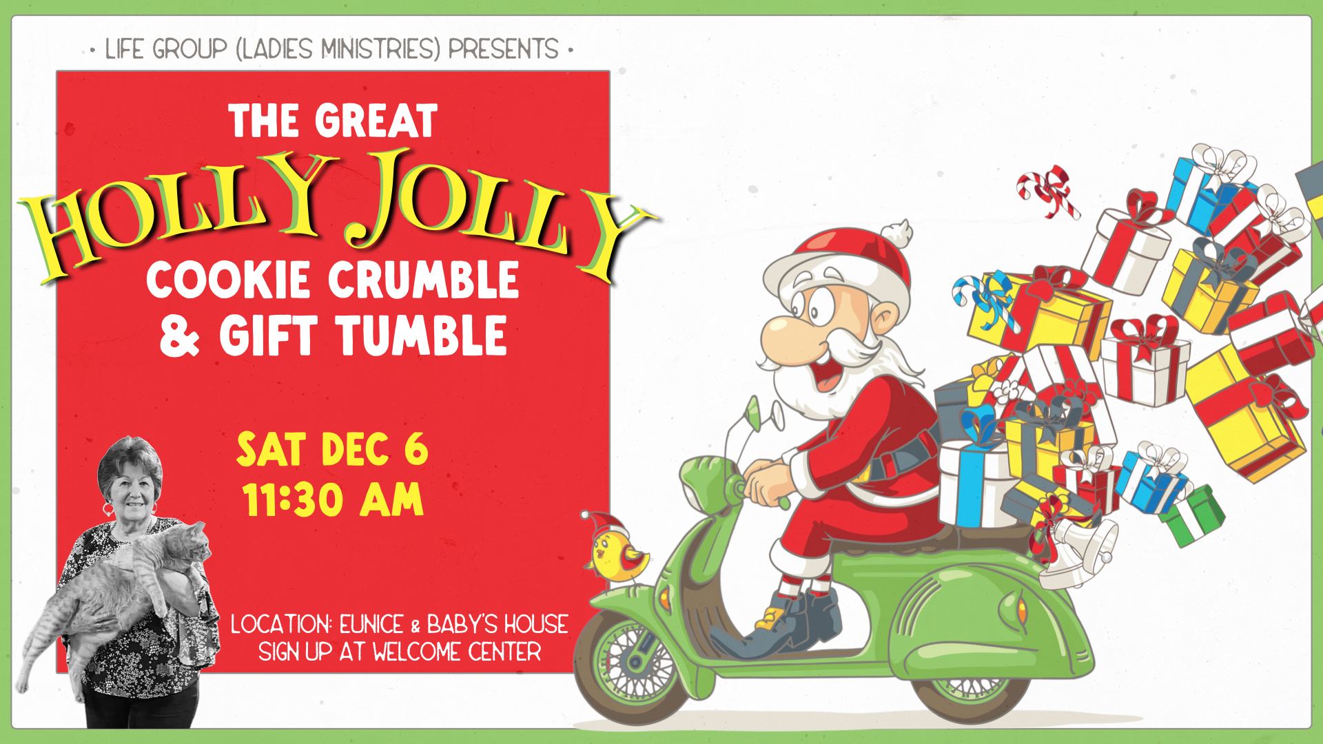 Ladies, let's celebrate the season together! Join us for The Great Holly Jolly Cookie Crumble & Gift Tumble! Want in on the gift fun? Bring a wrapped ornament, candle, or mug. We'll also enjoy a cookie exchange, so bring a batch to share! Lunch provided, $8